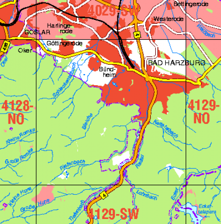 Maßstab 1:10 000, Nomenklatur: 4129-NW, Name des Kartenblatts: Bad Harzburg, Auflagejahr: 2022, Der Anteil Sachsen-Anhalt (ST) kann bis zur Landesgrenze Niedersachsen (NI) bereitgestellt werden. Das Gebiet zu NI wird als weiße Fläche dargestellt. Blattschnitt: Normalblattschnitt ...