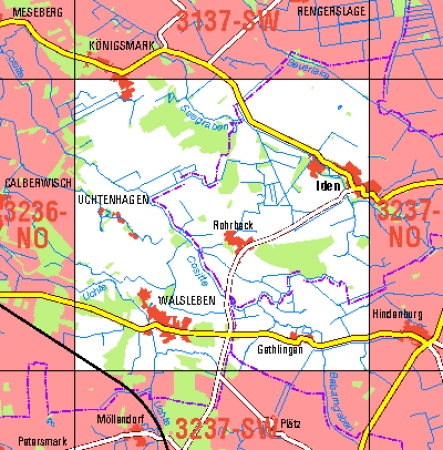 Maßstab 1:10 000, Nomenklatur: 3237-NW, Name des Kartenblatts: Iden, Auflagejahr: 2023, Blattschnitt: Normalblattschnitt (Preußische Landesaufnahme), Gradabteilungskarte mit 5 min geographischer Länge und 3 min geographischer Breite, Geodätischer Raumbezug: GRS80-Ellipsoid, ...
