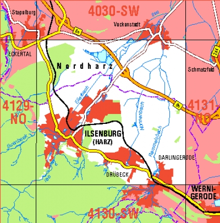 Maßstab 1:10 000, Nomenklatur: 4130-NW, Name des Kartenblatts: Ilsenburg (Harz), Auflagejahr: 2021, Blattschnitt: Normalblattschnitt (Preußische Landesaufnahme), Gradabteilungskarte mit 5 min geographischer Länge und 3 min geographischer Breite, Geodätischer Raumbezug: GRS80-Ellipsoid, ...