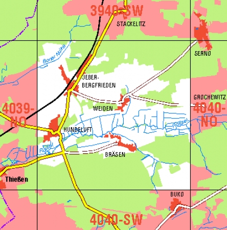 Maßstab 1:10 000, Nomenklatur: 4040-NW, Name des Kartenblatts: Jeber-Bergfrieden, Auflagejahr: 2021, Blattschnitt: Normalblattschnitt (Preußische Landesaufnahme), Gradabteilungskarte mit 5 min geographischer Länge und 3 min geographischer Breite, Geodätischer Raumbezug: ...