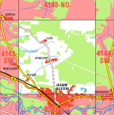 Maßstab 1:10 000, Nomenklatur: 4143-SO, Name des Kartenblatts: Jessen (Elster)-Arnsdorf, Auflagejahr: 2025, Blattschnitt: Normalblattschnitt (Preußische Landesaufnahme), Gradabteilungskarte mit 5 min geographischer Länge und 3 min geographischer Breite, Geodätischer Raumbezug: ...