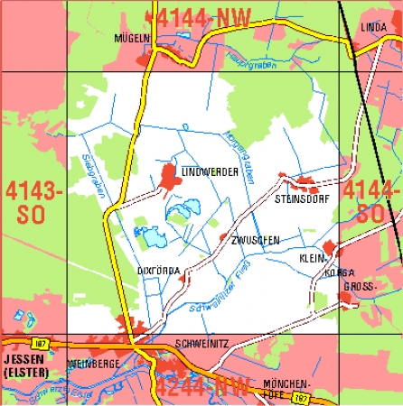 Maßstab 1:10 000, Nomenklatur: 4144-SW, Name des Kartenblatts: Jessen (Elster) -Lindwerder, Auflagejahr: 2024, Blattschnitt: Normalblattschnitt (Preußische Landesaufnahme), Gradabteilungskarte mit 5 min geographischer Länge und 3 min geographischer Breite, Geodätischer Raumbezug: ...