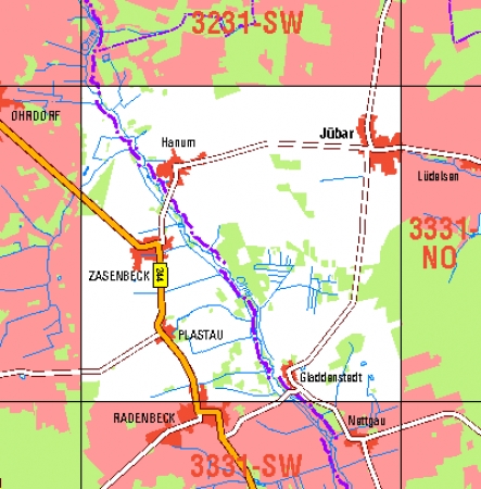 Maßstab 1:10 000, Nomenklatur: 3331-NW, Name des Kartenblatts: Jübar, Auflagejahr: 2022, Der Anteil Sachsen-Anhalt (ST) kann bis zur Landesgrenze Niedersachsen (NI) bereitgestellt werden. Das Gebiet zu NI wird als weiße Fläche dargestellt. Blattschnitt: Normalblattschnitt ...