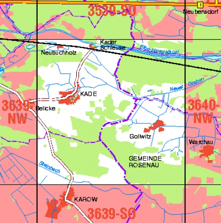 Maßstab 1:10 000, Nomenklatur: 3639-NO, Name des Kartenblatts: Kade, Auflagejahr: 2021, Blattschnitt: Normalblattschnitt (Preußische Landesaufnahme), Gradabteilungskarte mit 5 min geographischer Länge und 3 min geographischer Breite, Geodätischer Raumbezug: GRS80-Ellipsoid, ...