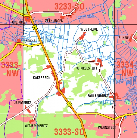 Maßstab 1:10 000, Nomenklatur: 3333-NO, Name des Kartenblatts: Kakerbeck, Auflagejahr: 2024, Blattschnitt: Normalblattschnitt (Preußische Landesaufnahme), Gradabteilungskarte mit 5 min geographischer Länge und 3 min geographischer Breite, Geodätischer Raumbezug: GRS80-Ellipsoid, ...