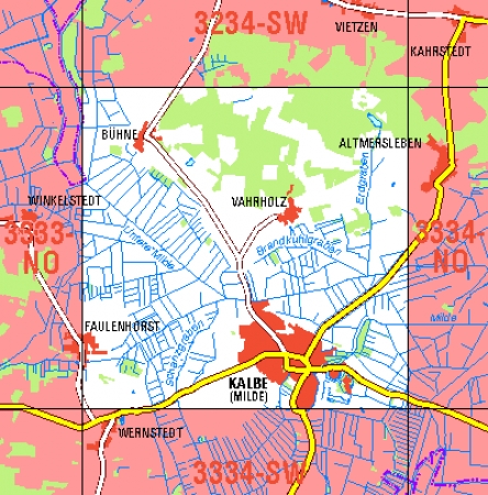 Maßstab 1:10 000, Nomenklatur: 3334-NW, Name des Kartenblatts: Kalbe (Milde), Auflagejahr: 2023, Blattschnitt: Normalblattschnitt (Preußische Landesaufnahme), Gradabteilungskarte mit 5 min geographischer Länge und 3 min geographischer Breite, Geodätischer Raumbezug: GRS80-Ellipsoid, ...