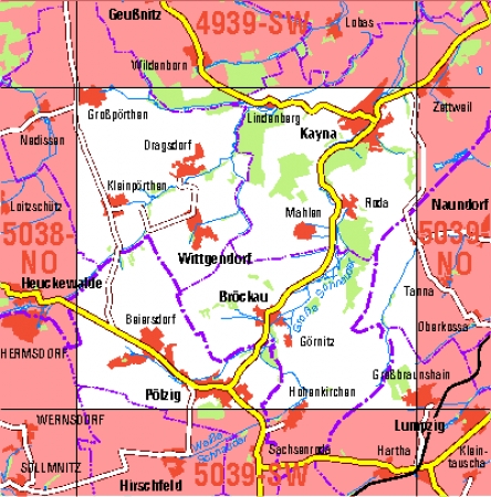 Maßstab 1:10 000, Nomenklatur: 5039-NW, Name des Kartenblatts: Kayna, Auflagejahr: 2021, Blattschnitt: Normalblattschnitt (Preußische Landesaufnahme), Gradabteilungskarte mit 5 min geographischer Länge und 3 min geographischer Breite, Geodätischer Raumbezug: GRS80-Ellipsoid, ...
