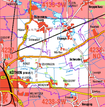 Maßstab 1:10 000, Nomenklatur: 4238-NW, Name des Kartenblatts: Osternienburg, Auflagejahr: 2021, Blattschnitt: Normalblattschnitt (Preußische Landesaufnahme), Gradabteilungskarte mit 5 min geographischer Länge und 3 min geographischer Breite, Geodätischer Raumbezug: GRS80-Ellipsoid, ...