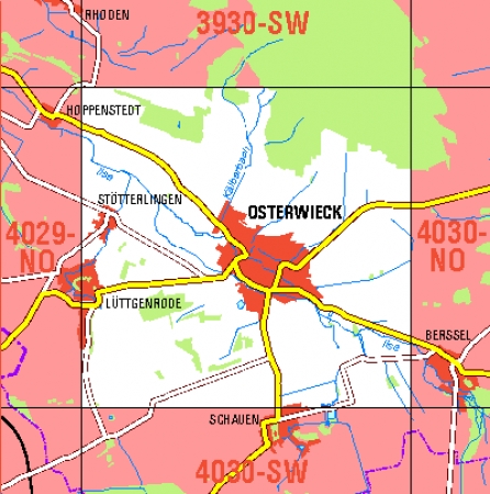 Maßstab 1:10 000, Nomenklatur: 4030-NW, Name des Kartenblatts: Osterwieck, Auflagejahr: 2025, Blattschnitt: Normalblattschnitt (Preußische Landesaufnahme), Gradabteilungskarte mit 5 min geographischer Länge und 3 min geographischer Breite, Geodätischer Raumbezug: GRS80-Ellipsoid, ...