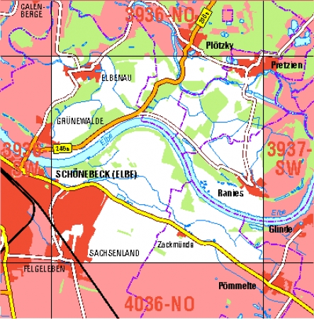 Maßstab 1:10 000, Nomenklatur: 3936-SW, Name des Kartenblatts: Schönebeck (Elbe), Auflagejahr: 2024, Blattschnitt: Normalblattschnitt (Preußische Landesaufnahme), Gradabteilungskarte mit 5 min geographischer Länge und 3 min geographischer Breite, Geodätischer Raumbezug: ...