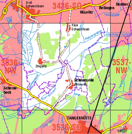 Maßstab 1:10 000, Nomenklatur: 3536-NO, Name des Kartenblatts: Schönwalde (Altmark), Auflagejahr: 2025, Blattschnitt: Normalblattschnitt (Preußische Landesaufnahme), Gradabteilungskarte mit 5 min geographischer Länge und 3 min geographischer Breite, Geodätischer Raumbezug: ...