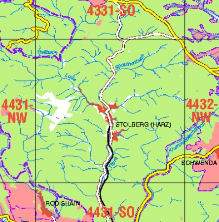 Maßstab 1:10 000, Nomenklatur: 4431-NO, Name des Kartenblatts: Stolberg (Harz), Auflagejahr: 2021, Blattschnitt: Normalblattschnitt (Preußische Landesaufnahme), Gradabteilungskarte mit 5 min geographischer Länge und 3 min geographischer Breite, Geodätischer Raumbezug: GRS80-Ellipsoid, ...