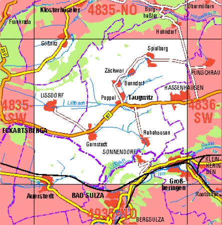 Maßstab 1:10 000, Nomenklatur: 4835-SO, Name des Kartenblatts: Taugwitz, Auflagejahr: 2022, Blattschnitt: Normalblattschnitt (Preußische Landesaufnahme), Gradabteilungskarte mit 5 min geographischer Länge und 3 min geographischer Breite, Geodätischer Raumbezug: GRS80-Ellipsoid, ...