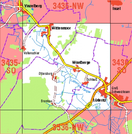 Maßstab 1:10 000, Nomenklatur: 3436-SW, Name des Kartenblatts: Lüderitz, Auflagejahr: 2024, Blattschnitt: Normalblattschnitt (Preußische Landesaufnahme), Gradabteilungskarte mit 5 min geographischer Länge und 3 min geographischer Breite, Geodätischer Raumbezug: GRS80-Ellipsoid, ...