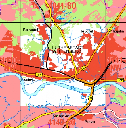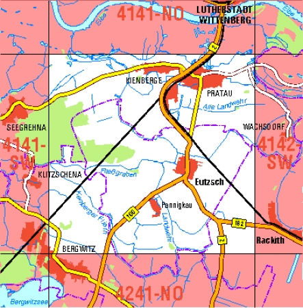 Maßstab 1:10 000, Nomenklatur: 4141-NO, Name des Kartenblatts: Lutherstadt Wittenberg, Auflagejahr: 2025, Blattschnitt: Normalblattschnitt (Preußische Landesaufnahme), Gradabteilungskarte mit 5 min geographischer Länge und 3 min geographischer Breite, Geodätischer Raumbezug: ...
