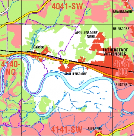 Maßstab 1:10 000, Nomenklatur: 4141-NW, Name des Kartenblatts: Lutherstadt Wittenberg-Apollensdorf, Auflagejahr: 2022, Blattschnitt: Normalblattschnitt (Preußische Landesaufnahme), Gradabteilungskarte mit 5 min geographischer Länge und 3 min geographischer Breite, Geodätischer ...