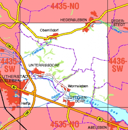 Maßstab 1:10 000, Nomenklatur: 4435-SW, Name des Kartenblatts: Lutherstadt Eisleben, Auflagejahr: 2022, Blattschnitt: Normalblattschnitt (Preußische Landesaufnahme), Gradabteilungskarte mit 5 min geographischer Länge und 3 min geographischer Breite, Geodätischer Raumbezug: ...