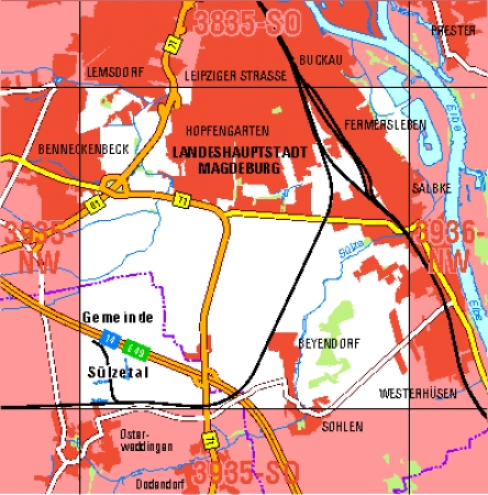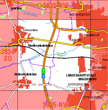 Maßstab 1:10 000, Nomenklatur: 3935-NW, Name des Kartenblatts: Magdeburg-Ottersleben, Auflagejahr: 2023, Blattschnitt: Normalblattschnitt (Preußische Landesaufnahme), Gradabteilungskarte mit 5 min geographischer Länge und 3 min geographischer Breite, Geodätischer Raumbezug: ...