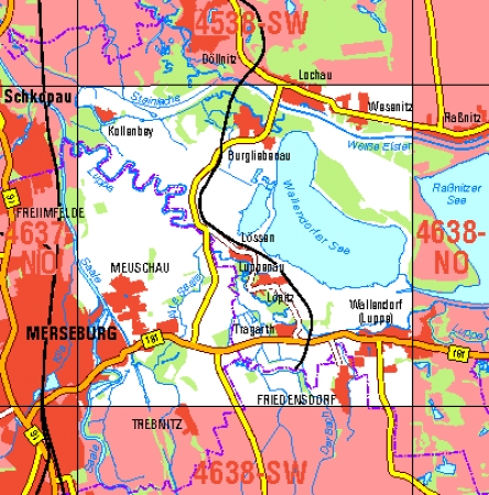 Maßstab 1:10 000, Nomenklatur: 4638-NW, Name des Kartenblatts: Merseburg-Meuschau, Auflagejahr: 2023, Blattschnitt: Normalblattschnitt (Preußische Landesaufnahme), Gradabteilungskarte mit 5 min geographischer Länge und 3 min geographischer Breite, Geodätischer Raumbezug: ...