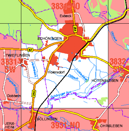 Maßstab 1:10 000, Nomenklatur: 3831-SO, Name des Kartenblatts: Schöningen, Auflagejahr: 2022, Der Anteil Sachsen-Anhalt (ST) kann bis zur Landesgrenze Niedersachsen (NI) bereitgestellt werden. Das Gebiet zu NI wird als weiße Fläche dargestellt. Blattschnitt: Normalblattschnitt ...