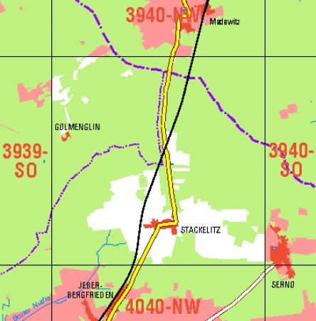 Maßstab 1:10 000, Nomenklatur: 3940-SW, Name des Kartenblatts: Stackelitz, Auflagejahr: 2021, Blattschnitt: Normalblattschnitt (Preußische Landesaufnahme), Gradabteilungskarte mit 5 min geographischer Länge und 3 min geographischer Breite, Geodätischer Raumbezug: GRS80-Ellipsoid, ...