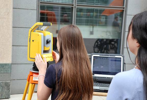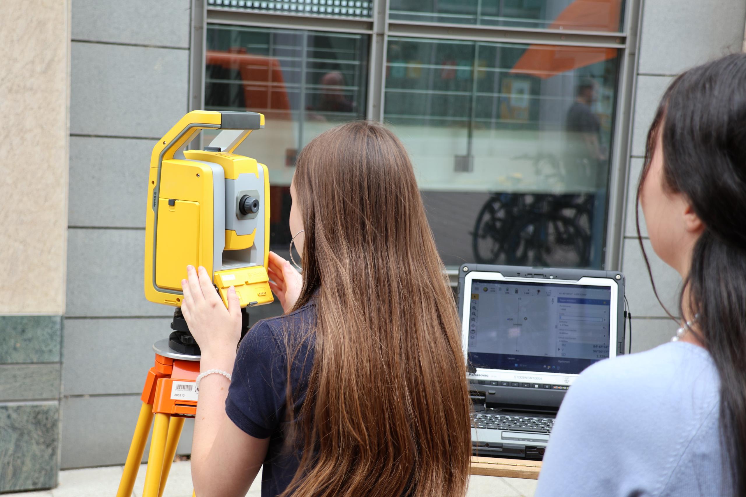 Unter anderem erfuhren die Schülerinnen und Schüler etwas über die 3D-Erfassung von Gebäudemodellen, die Arbeit der Wertermittlung und erprobten im „Außendienst“ Geräte wie Tachymeter und Nivellier.