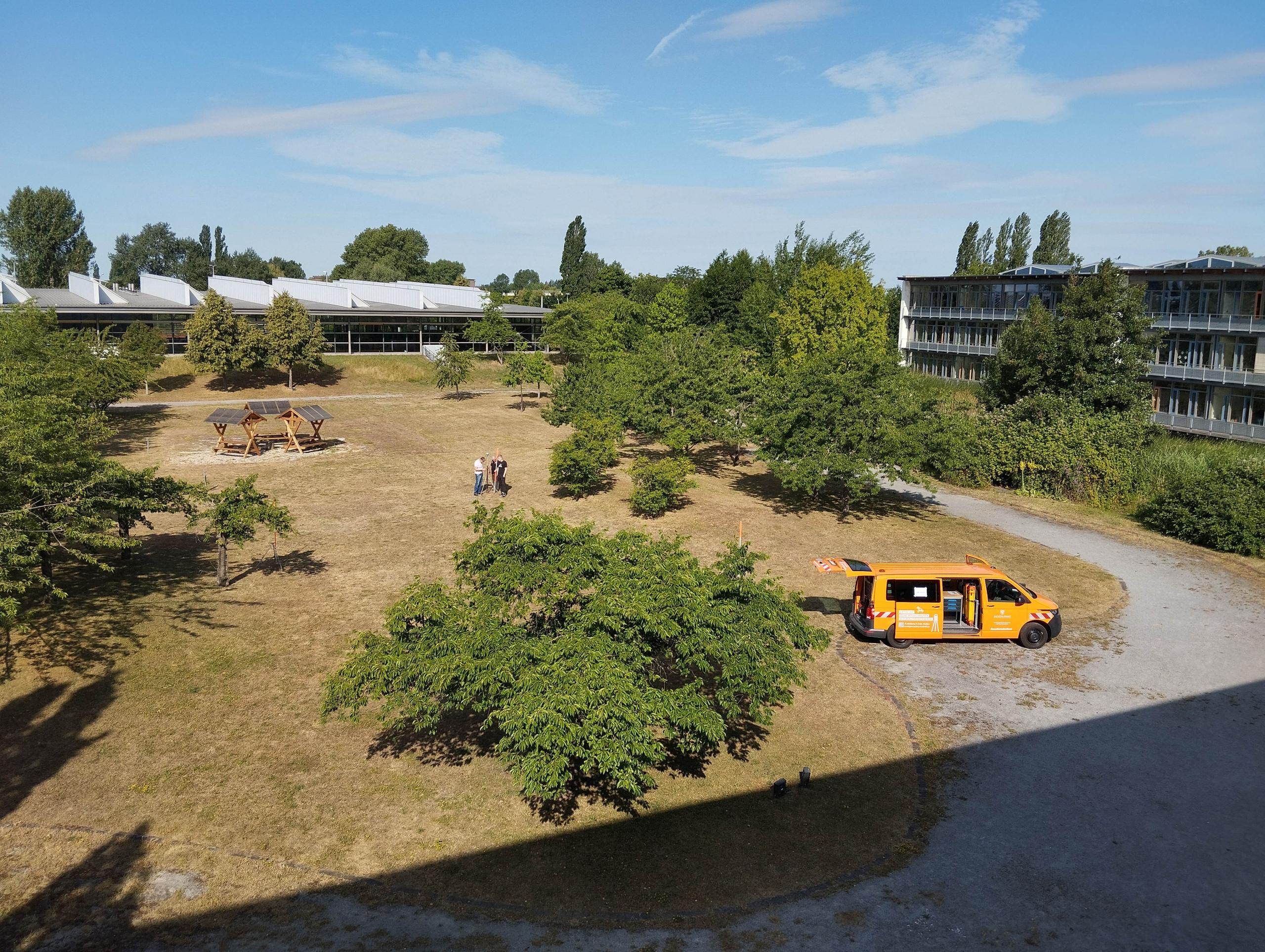 Der LVermGeo Standort Dessau-Roßlau führte den Tag der Geodäsie am 24. Juni am Anhaltischen Berufsschulzentrum „Hugo Junkers“ durch. Die Mitarbeitenden des LVermGeo bauten insgesamt fünf Stationen auf, die den 16 teilnehmenden Schülerinnen und Schülern das Berufsfeld der Geodäsie näherbrachten. In Gruppen konnten die Teilnehmenden unter anderem mit einer AR-Brille durch virtuelle 3D-Gebäudemodelle gehen, mit technischen Messgeräten Entfernungen und Höhen messen sowie Punkte abstecken und das Nivellieren üben. Außerdem zeigten die Mitarbeitenden des LVermGeo ihnen digitale Karten und führten geodätische Berechnungen durch.