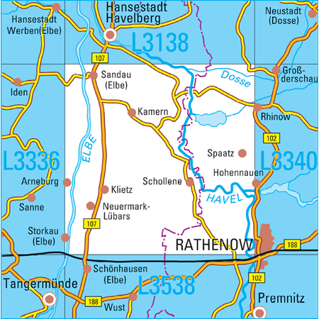 Maßstab 1:50 000, Nomenklatur: L3538, Name des Kartenblatts: Genthin, Auflagejahr: 2023, Blattschnitt: Normalblattschnitt (Preußische Landesaufnahme), Gradabteilungskarte mit 20 min geographischer Länge und 12 min geographischer Breite, Geodätischer Raumbezug: GRS80-Ellipsoid, ...