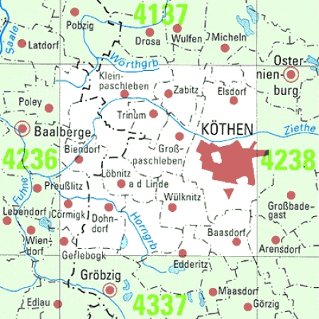 Maßstab 1:25 000, Nomenklatur: 4237, Name des Kartenblatts: Köthen (Anhalt), Auflagejahr: 2024, Blattschnitt: Normalblattschnitt (Preußische Landesaufnahme), Gradabteilungskarte mit 10 min geographischer Länge und 6 min geographischer Breite, Geodätischer Raumbezug: ...