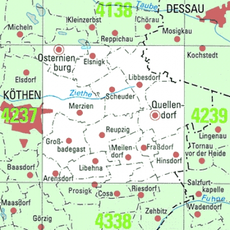 Maßstab 1:25 000, Nomenklatur: 4238, Name des Kartenblatts: Osternienburg, Auflagejahr: 2023, Blattschnitt: Normalblattschnitt (Preußische Landesaufnahme), Gradabteilungskarte mit 10 min geographischer Länge und 6 min geographischer Breite, Geodätischer Raumbezug: GRS80-Ellipsoid, ...