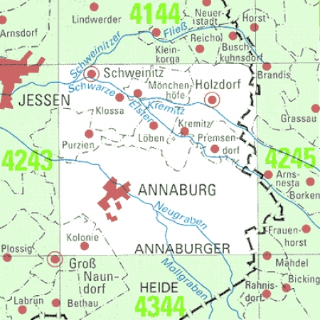Maßstab 1:25 000, Nomenklatur: 4244, Name des Kartenblatts: Annaburg, Auflagejahr: 2022, Blattschnitt: Normalblattschnitt (Preußische Landesaufnahme), Gradabteilungskarte mit 10 min geographischer Länge und 6 min geographischer Breite, Geodätischer Raumbezug: GRS80-Ellipsoid, ...