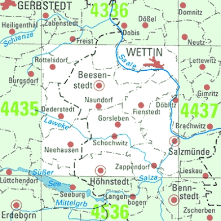 Maßstab 1:25 000, Nomenklatur: 4436, Name des Kartenblatts: Wettin, Auflagejahr: 2025, Blattschnitt: Normalblattschnitt (Preußische Landesaufnahme), Gradabteilungskarte mit 10 min geographischer Länge und 6 min geographischer Breite, Geodätischer Raumbezug: GRS80-Ellipsoid, ...