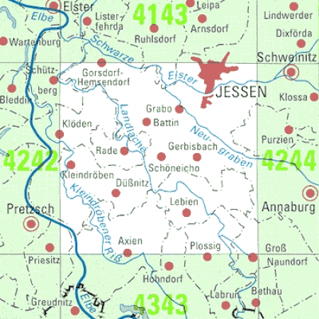 Maßstab 1:25 000, Nomenklatur: 4243, Name des Kartenblatts: Jessen (Elster), Auflagejahr: 2025, Blattschnitt: Normalblattschnitt (Preußische Landesaufnahme), Gradabteilungskarte mit 10 min geographischer Länge und 6 min geographischer Breite, Geodätischer Raumbezug: GRS80-Ellipsoid, ...