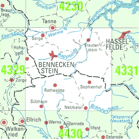 Maßstab 1:25 000, Nomenklatur: 4330, Name des Kartenblatts: Benneckenstein (Harz), Auflagejahr: 2025, Blattschnitt: Normalblattschnitt (Preußische Landesaufnahme), Gradabteilungskarte mit 10 min geographischer Länge und 6 min geographischer Breite, Geodätischer Raumbezug: ...