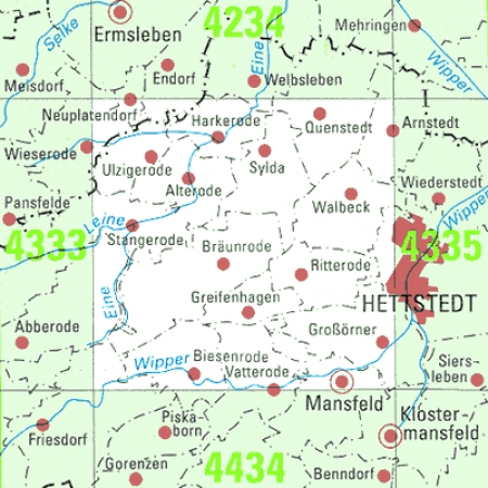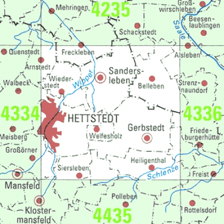 Maßstab 1:25 000, Nomenklatur: 4335, Name des Kartenblatts: Hettstedt, Auflagejahr: 2024, Blattschnitt: Normalblattschnitt (Preußische Landesaufnahme), Gradabteilungskarte mit 10 min geographischer Länge und 6 min geographischer Breite, Geodätischer Raumbezug: GRS80-Ellipsoid, ...