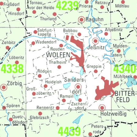 Maßstab 1:25 000, Nomenklatur: 4339, Name des Kartenblatts: Bitterfeld-Wolfen, Auflagejahr: 2023, Blattschnitt: Normalblattschnitt (Preußische Landesaufnahme), Gradabteilungskarte mit 10 min geographischer Länge und 6 min geographischer Breite, Geodätischer Raumbezug: GRS80-Ellipsoid, ...