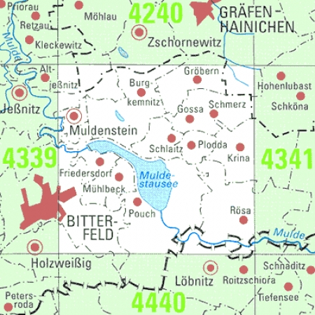 Maßstab 1:25 000, Nomenklatur: 4340, Name des Kartenblatts: Pouch, Auflagejahr: 2023, Blattschnitt: Normalblattschnitt (Preußische Landesaufnahme), Gradabteilungskarte mit 10 min geographischer Länge und 6 min geographischer Breite, Geodätischer Raumbezug: GRS80-Ellipsoid, ...