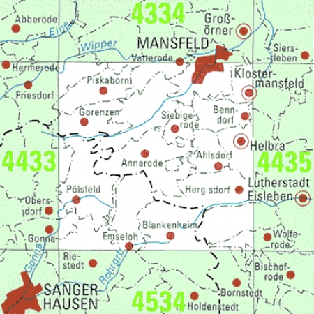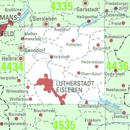 Maßstab 1:25 000, Nomenklatur: 4435, Name des Kartenblatts: Lutherstadt Eisleben, Auflagejahr: 2024, Blattschnitt: Normalblattschnitt (Preußische Landesaufnahme), Gradabteilungskarte mit 10 min geographischer Länge und 6 min geographischer Breite, Geodätischer Raumbezug: ...
