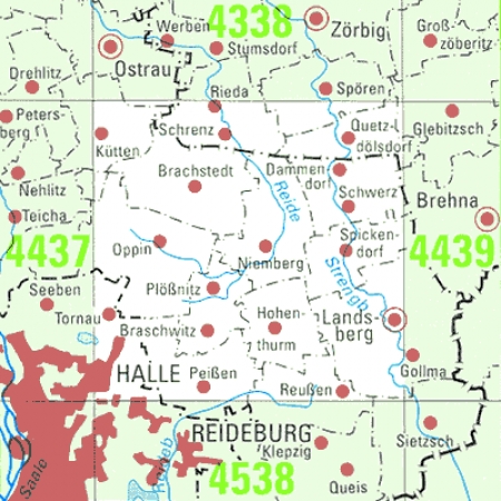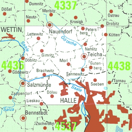 Maßstab 1:25 000, Nomenklatur: 4437, Name des Kartenblatts: Halle (Saale) Nord, Auflagejahr: 2023, Blattschnitt: Normalblattschnitt (Preußische Landesaufnahme), Gradabteilungskarte mit 10 min geographischer Länge und 6 min geographischer Breite, Geodätischer Raumbezug: GRS80-Ellipsoid, ...