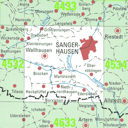 Maßstab 1:25 000, Nomenklatur: 4533, Name des Kartenblatts: Sangerhausen, Auflagejahr: 2025, Blattschnitt: Normalblattschnitt (Preußische Landesaufnahme), Gradabteilungskarte mit 10 min geographischer Länge und 6 min geographischer Breite, Geodätischer Raumbezug: GRS80-Ellipsoid, ...