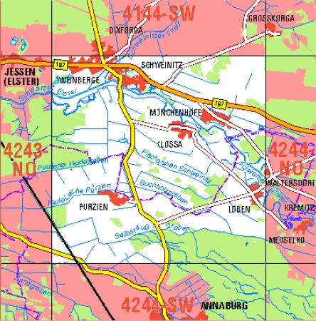 Maßstab 1:10 000, Nomenklatur: 4244-NW, Name des Kartenblatts: Annaburg-Purzien, Auflagejahr: 2023, Blattschnitt: Normalblattschnitt (Preußische Landesaufnahme), Gradabteilungskarte mit 5 min geographischer Länge und 3 min geographischer Breite, Geodätischer Raumbezug: GRS80-Ellipsoid, ...