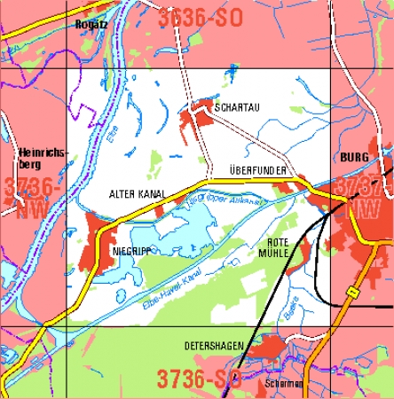 Maßstab 1:10 000, Nomenklatur: 3736-NO, Name des Kartenblatts: Burg-Niegripp, Auflagejahr: 2023, Blattschnitt: Normalblattschnitt (Preußische Landesaufnahme), Gradabteilungskarte mit 5 min geographischer Länge und 3 min geographischer Breite, Geodätischer Raumbezug: GRS80-Ellipsoid, ...