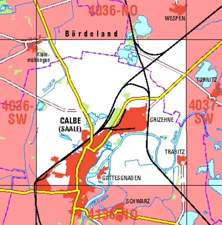 Maßstab 1:10 000, Nomenklatur: 4036-SO, Name des Kartenblatts: Calbe (Saale), Auflagejahr: 2022, Blattschnitt: Normalblattschnitt (Preußische Landesaufnahme), Gradabteilungskarte mit 5 min geographischer Länge und 3 min geographischer Breite, Geodätischer Raumbezug: GRS80-Ellipsoid, ...