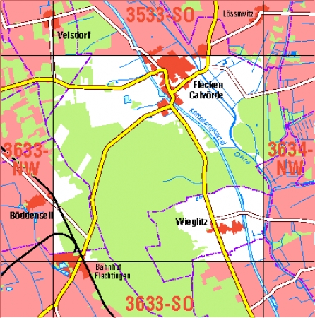 Maßstab 1:10 000, Nomenklatur: 3633-NO, Name des Kartenblatts: Calvörde, Auflagejahr: 2024, Blattschnitt: Normalblattschnitt (Preußische Landesaufnahme), Gradabteilungskarte mit 5 min geographischer Länge und 3 min geographischer Breite, Geodätischer Raumbezug: GRS80-Ellipsoid, ...