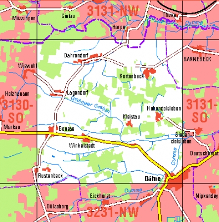 Maßstab 1:10 000, Nomenklatur: 3131-SW, Name des Kartenblatts: Dähre, Auflagejahr: 2022, Der Anteil Sachsen-Anhalt (ST) kann bis zur Landesgrenze Niedersachsen (NI) bereitgestellt werden. Das Gebiet zu NI wird als weiße Fläche dargestellt. Blattschnitt: Normalblattschnitt ...