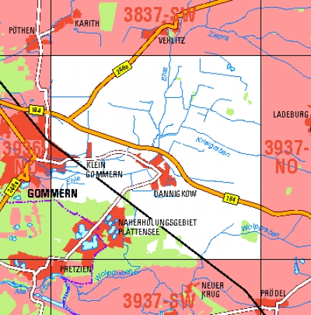 Maßstab 1:10 000, Nomenklatur: 3937-NW, Name des Kartenblatts: Dannigkow, Auflagejahr: 2021, Blattschnitt: Normalblattschnitt (Preußische Landesaufnahme), Gradabteilungskarte mit 5 min geographischer Länge und 3 min geographischer Breite, Geodätischer Raumbezug: GRS80-Ellipsoid, ...