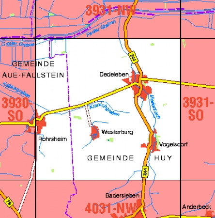 Maßstab 1:10 000, Nomenklatur: 3931-SW, Name des Kartenblatts: Dedeleben, Auflagejahr: 2025, Der Anteil Sachsen-Anhalt (ST) kann bis zur Landesgrenze Niedersachsen (NI) bereitgestellt werden. Das Gebiet zu NI wird als weiße Fläche dargestellt. Blattschnitt: Normalblattschnitt ...