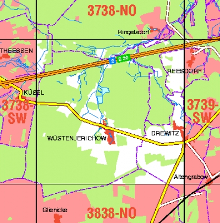 Maßstab 1:10 000, Nomenklatur: 3738-SO, Name des Kartenblatts: Drewitz, Auflagejahr: 2022, Blattschnitt: Normalblattschnitt (Preußische Landesaufnahme), Gradabteilungskarte mit 5 min geographischer Länge und 3 min geographischer Breite, Geodätischer Raumbezug: GRS80-Ellipsoid, ...
