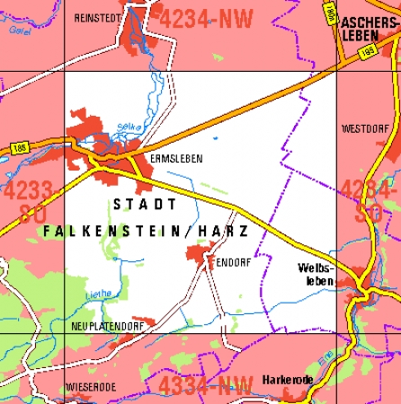 Maßstab 1:10 000, Nomenklatur: 4234-SW, Name des Kartenblatts: Ermsleben, Auflagejahr: 2023, Blattschnitt: Normalblattschnitt (Preußische Landesaufnahme), Gradabteilungskarte mit 5 min geographischer Länge und 3 min geographischer Breite, Geodätischer Raumbezug: GRS80-Ellipsoid, ...
