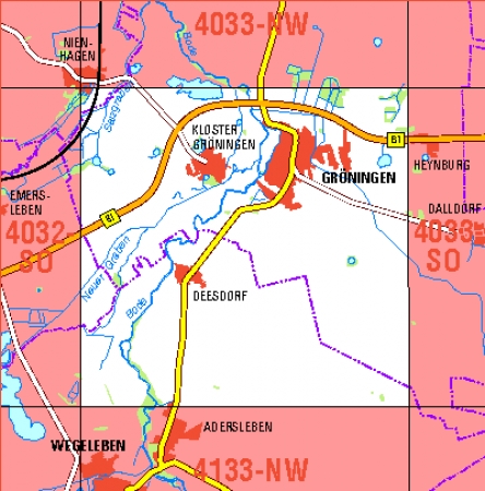 Maßstab 1:10 000, Nomenklatur: 4033-SW, Name des Kartenblatts: Gröningen, Auflagejahr: 2025, Blattschnitt: Normalblattschnitt (Preußische Landesaufnahme), Gradabteilungskarte mit 5 min geographischer Länge und 3 min geographischer Breite, Geodätischer Raumbezug: GRS80-Ellipsoid, ...